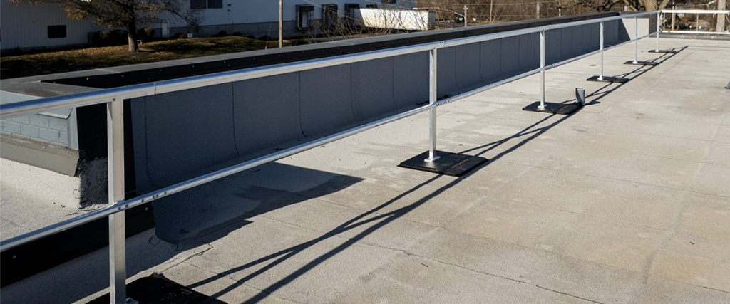 A: With weighted guard rail, there’s no penetration into the roof system. It’s ideal for temporary, infrequent access and comes with a lower initial cost. It’s portable, movable, and suitable for short-duration work. You can even include sections with a hinged gate, too.